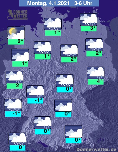 In der Nacht zum Montag bleibt es lediglich im Nordseeumfeld und im Südosten des Landes meist trocken, jedoch überwiegend stark bewölkt. Über der restlichen Republik halten sich dichte Wolken und es fällt immer wieder Schnee, Schneeregen oder Regen. Die Temperatur sinkt auf 3 Grad in Stralsund und bis -1 Grad am Hunsrück.