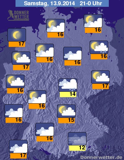 Am Abend bildet sich in Ostdeutschland zeitweise Schauer und Gewitter, sonst fällt bei meist wechselnder bis starker Bewölkung hier und da etwas Regen, vielfach bildet sich Nebel oder Dunst. Meist aufgelockert oder klar ist es dagegen vom Nordwesten, über Westdeutschland bis ins Saarland, hier bleibt es weitgehend trocken, jedoch bildet sich stellenweise Nebel. Die Temperatur liegt am Abend bei 17 Grad entlang der Ems und etwa 12 Grad im Allgäu.