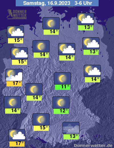 In der kommenden Nacht zeigt sich der Himmel sternenklar oder leicht bewölkt. Es bleibt überall trocken bei Tiefstwerten von 17 Grad in Köln und 11 Grad in Jena.