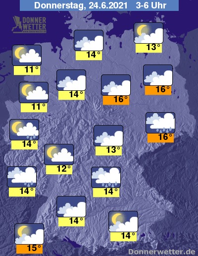In der folgenden Nacht ist der Himmel über dem Norden und Westen teils nur locker, teils auch stark bewölkt, dazu bleibt es hier weitgehend trocken. Weiter nach Osten und Süden hin zieht hingegen überwiegend dichte Bewölkung durch, dazu können sich einzelne Schauer und vereinzelt auch Gewitter bilden. Die Temperatur sinkt auf 16 Grad in Magdeburg und bis 11 Grad in Emden.