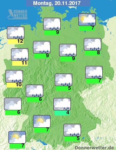 Heute zeigt sich das Wetter verbreitet grau, dunkel und nass und es fällt häufiger und auch langanhaltender Regen, am Bayerischen Wald auch Schneeregen oder Schnee. Im Südwesten ist es teils stark, teils aufgelockert bewölkt, hier bleibt es größtenteils trocken. Die Temperatur steigt nur auf 4 Grad in Oberfranken und bis 12 Grad im nördlichen Emsland. Im Nordwesten des Landes weht ein zunehmend starker, an der Nordsee auch stürmischer Wind.