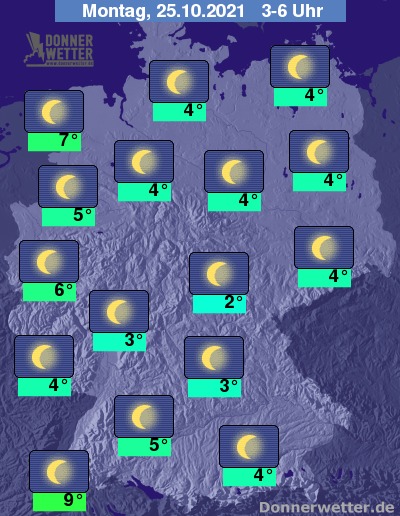 In der Nacht zum Montag ist der Himmel über der Bundesrepublik sternenklar, dazu bleibt es trocken. Die Temperatur sinkt auf 9 Grad in Freiburg und bis etwa 2 Grad in Jena.
