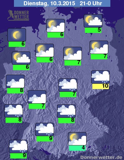 Heute Abend zieht das Regenband langsam weiter in Richtung Südosten, im Südosten selbst bleibt es aber noch weitgehend aufgelockert bewölkt und trocken. Hinter dem Regenband lockert die Bewölkung nach Nordwesten hin immer weiter auf, und im Norden und Nordwesten ist es im weiteren Verlauf auch häufig sternenklar und dazu trocken. Die Abendtemperatur liegt bei 10 Grad in der Lausitz und um 4 Grad im Chiemgau.