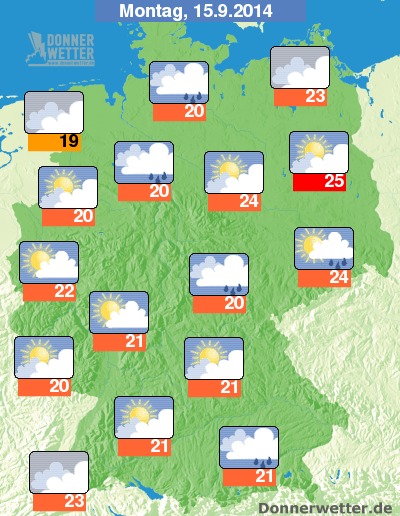 Die Woche beginnt in der Mitte, sowie im Norden und Osten häufig wechselhaft, bei wechselnder bis starker Bewölkung können sich hier Schauer und auch einzelne Gewitter bilden, auch im Süden ist es häufig stark bewölkt, dabei fällt jedoch nur selten etwas Regen. Freundlich mit zeitweiligem Sonnenschein ist es vom südwestlichen Niedersachsen, über NRW, Hessen, Rheinland-Pfalz bis ins Saarland, hier bleibt es weitgehend trocken. Die Temperatur steigt auf 19 Grad in Ostfriesland und sommerliche 25 Grad in Berlin.