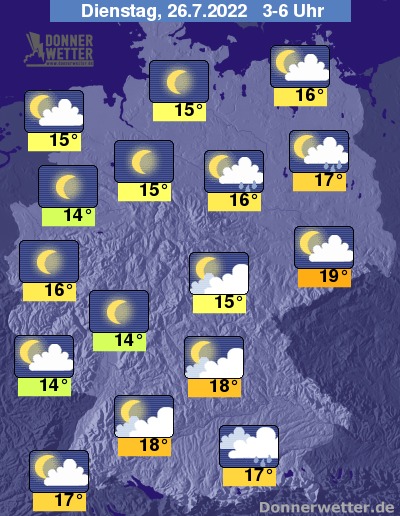 In der Nacht zum Dienstag zeigt sich der Himmel über dem Norden und Westen meist sternenklar oder gering bewölkt, dazu bleibt es trocken. Dagegen hält sich über der Südosthälfte Deutschlands überwiegend starke Bewölkung und im Osten und an den Alpen können sich gebietsweise Schauer, selten auch Gewitter bilden. Die Temperatur sinkt auf 19 Grad in der Lausitz und bis 14 Grad im Münsterland.