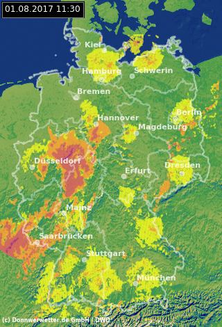 Zum Großteil ist es dennoch heiter oder zumindest noch aufgelockert bewölkt und zunächst trocken. Die Temperatur liegt bei 21 Grad an der Nordsee und bis 35 Grad in Dresden. Das Radarbild zeigt den Regen, wie er von Westen aufkommt.