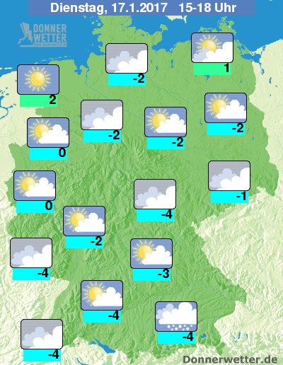 Die Temperaturen erreichen Höchstwerte um -5 Grad C im Thüringer Wald und um +2 Grad C in Ostfriesland.