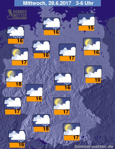 In der Nacht zum Mittwoch ziehen überwiegend dichte Wolken übers Land hinweg, dazu bilden sich über dem Südwesten sowie im Norden und Nordwesten einzelne Schauer oder es regnet hier zeitweise. Im übrigen Land ist der Himmel auch hier und da aufgelockert bewölkt, zudem bleibt es meist trocken. Die Temperatur sinkt auf milde 19 bis 15 Grad.