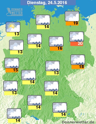 Die Temperaturen hauen auch nicht gerade vom Hocker: Höchstwerte um 13 Grad C im Thüringer Wald und um 20 Grad C in der Bundeshauptstadt.