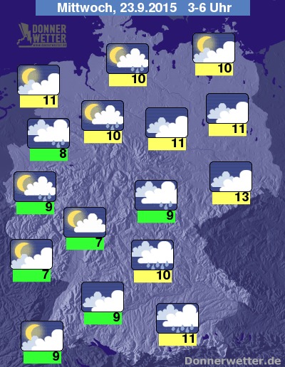 In der bevorstehenden Nacht lockert die Bewölkung im Westen und teils auch im Südwesten der Republik auf und es bleibt überwiegend trocken. In den anderen Landesteilen ziehen hingegen größtenteils dichte Wolken durch und es fällt gebietsweise, im Süden zeitweise, in Alpennähe auch langanhaltender und ergiebiger Regen. Die Tiefstwerte liegen bei 13 Grad in Leipzig und um 7 Grad am Taunus.