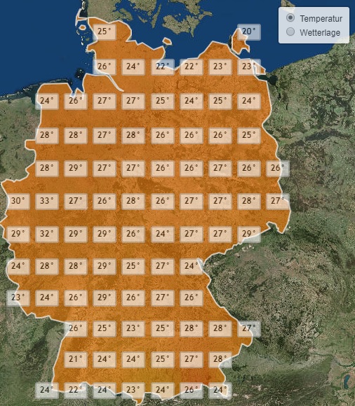 Etwas kühler bleibt es nur entlang des Schwarzwalds und an der Ostsee. Hier steigen die Temperaturen stellenweise nur knapp über die 20 Grad Marke.