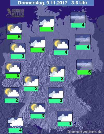 In der bevorstehenden Nacht bringen dichte Wolken im Südwesten gebietsweise Regen oder Schneeregen, auch sonst bleibt es im Süden meist bedeckt und hier und da ist etwas Regen oder Schneeregen möglich. Weiter nach Norden hin ist es hingegen überwiegend locker oder aufgelockert bewölkt, zum Teil auch sternenklar, dabei bleibt es trocken. Die Temperatur sinkt auf 6 Grad an der Nordsee und bis 2 Grad im Saargau.
