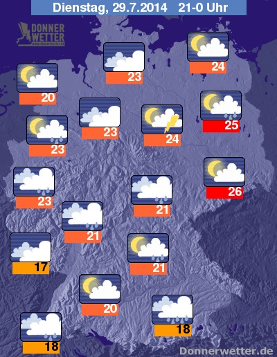 Heute Abend bilden sich verbreitet weitere Schauer und Gewitter, die zum Teil kräftig ausfallen können. Weitgehend trocken bleibt es dagegen im Küstenumfeld. Die Abendwerte liegen bei sehr warmen 26 Grad in Chemnitz und teils kühlen 17 Grad im Saarland.