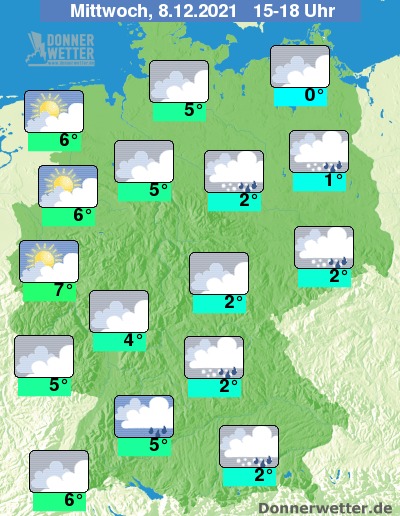 Die Temperaturen erreichen am Nachmittag Höchstwerte um 0 Grad in Nordmecklenburg, 2 Grad am Alpenrand und 7 Grad in der Kölner Bucht