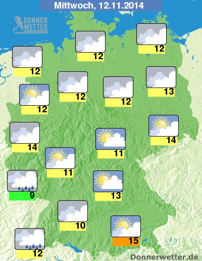 Der heutige Mittwoch hält meist viele Wolken für uns bereit. In Norddeutschland bleibt die Wolkendecke überwiegend geschlossen, dabei bleibt es aber zumeist trocken. Im Südwesten und äußeren Westen ziehen dichte Wolken mit Regen auf. In den übrigen Landesteilen kann sich die Sonne zumindest hin und wieder mal zeigen und es bleibt dabei trocken. Am freundlichsten wird es in einem Streifen von Thüringen bis nach Ostbayern, hier heitert der Himmel vielerorts auf. Die Temperatur steigt auf kühle 9 Grad am Pfälzer Wald und bis auf milde 15 Grad im Berchtesgadener Land.