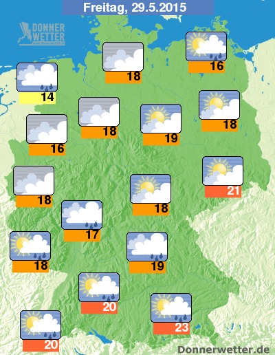Am Freitag ist es über der Nordhälfte Deutschlands verbreitet wechselnd oder stark bewölkt, dabei sind im Küstenumfeld zeitweise Schauer möglich, sonst bleibt es weitgehend trocken. Über der Südhälfte des Landes ist es zunächst oft heiter und trocken, im Tagesverlauf bilden sich hier jedoch teils kräftige Schauer und auch Gewitter. Die Temperatur steigt auf 14 Grad an der Nordsee und bis 23 Grad in München.