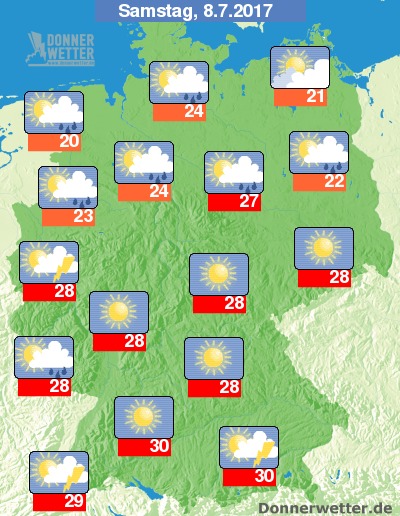 Heute scheint insbesondere im Süden Deutschlands verbreitet die Sonne, hier bilden sich im Tagesverlauf bevorzugt im Alpenvorland, aber auch entlang des Rheins teils kräftige Schauer und Gewitter, sonst ist es meist trocken. Weiter nach Norden ist es teils heiter, teilweise ziehen aber auch dichte Wolken durch, dazu sind gebietsweise Schauer und auch Gewitter möglich. Die Temperatur steigt auf 20 bis 30 Grad.