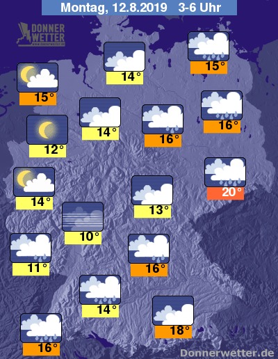 In der Nacht zum Montag halten sich besonders über dem Süden, aber auch über dem Osten dichte Wolken und es fällt zum Teil kräftiger und gewittriger Regen. Über der Nordwesthälfte ist es hingegen oft nur gering bis wechselnd und nur vorübergehend auch mal stark bewölkt, dazu bleibt es hier weitgehend trocken. Die Temperatur sinkt auf 20 Grad in Dresden und bis 10 Grad am Westerwald.
