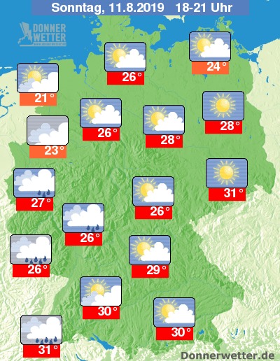 Heute Abend ziehen westlich des Rheins dichte Wolken auf, die gebietsweise Schauer oder Regen, im Südwesten auch örtliche Gewitter bringen. Weiter nach Osten hin bleibt es hingegen weiterhin heiter bis sonnig und dazu trocken. Die Temperatur liegt bei 21 Grad in Cuxhaven und bis 31 Grad in Dresden.