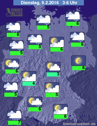 In der kommenden Nacht bleibt es über der breiten Landesmitte meist locker oder aufgelockert bewölkt und trocken. Über dem Norden sowie über dem Süden von Deutschland ziehen dagegen verbreitet dichte Wolken und es fällt zeitweise, teils kräftiger Regen. Die Temperatur sinkt auf 7 Grad im Breisgau und bis 3 Grad im Vogtland. Es weht teils starker, im Norden teils stürmischer Wind. An den Küsten und auf den Bergen der norddeutschen Mittelgebirge herrscht teils Sturm, dabei sind auch orkanartige Böen möglich.