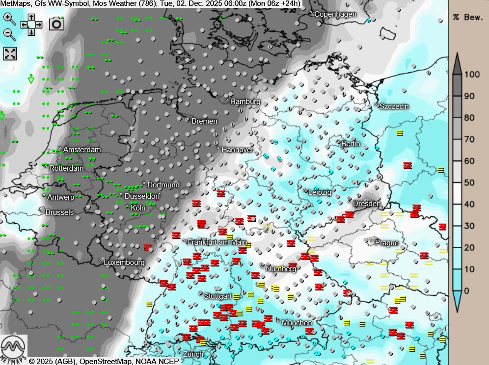 Am Dienstag zeigt sich der Himmel über dem Westen und Nordwesten stark bewökt, dabei fällt zeit- und gebietsweise etwas Regen oder Sprühregen. Sonst ist es heute teils nebelig-trüb, teils heiter und es bleibt trocken.