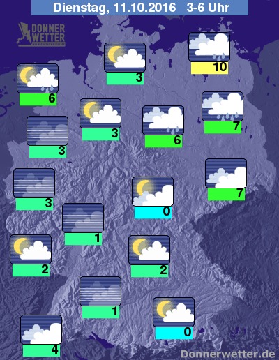 In der Nacht zum Dienstag ziehen im Nordosten und Norden dichte Wolken mit zeitweiligem Regen durch. Weiter nach Südwesten ist es dagegen verbreitet sternenklar oder nur locker bewölkt und dazu auch trocken. Die Temperatur sinkt auf 10 bis 0 Grad. Stellenweise bildet sich Nebel oder Hochnebel, dabei ist teils mit Rauhreif zu rechnen!