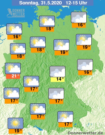 Heute Abend ist es größtenteils aufgelockert bis stark, vor allem von Bayern bis nach Thüringen und zum Erzgebirge oft dicht bewölkt, hier bleibt es weitgehend, sonst komplett trocken. Am meisten scheint die Sonne über dem Norden und Westen des Landes. Die Temperatur liegt bei 16 Grad in Erfurt und bi 22 Grad in Köln.