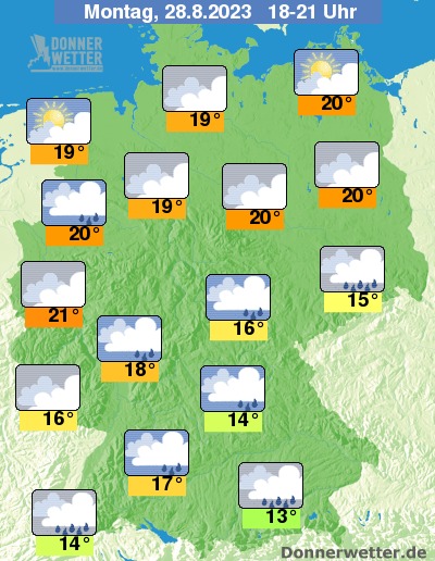 Heute Abend bleibt es vom Süden bis nach Sachsen bei weitgehend dichten Wolken und es fällt dabei zeitweise Regen. Weiter nach Nordwesten hin ist es teils stark, teils aufgelockert bewölkt und dazu weitgehend trocken. Die Temperatur liegt bei 13 Grad in München und bis 21 Grad in Köln.