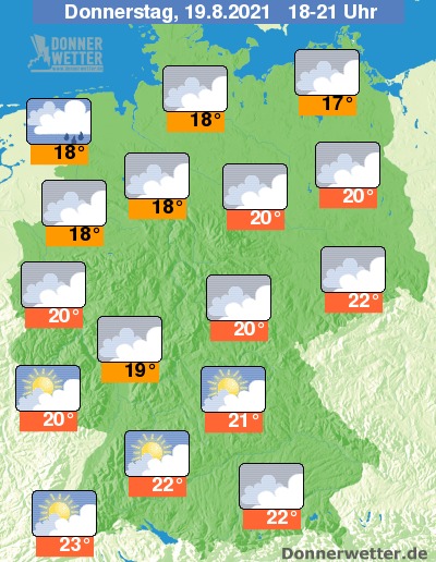 Heute Abend ist es weiterhin zum Großteil stark, hier und da aufgelockert bewölkt. Im Nordwesten bilden sich einzelne, im übrigen Norden und Westen nur vereinzelt Schauer. Sonst bleibt es trocken, im Süden scheint vielerorts die Sonne. Die Temperatur liegt bei 17 Grad an der Müritz und bis 23 Grad am Oberrhein.