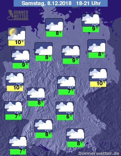 In der Nacht zum Sonntag ziehen von Westen her kompakte Wolken und teils kräftiger Regen durch. Die Temperatur sinkt auf Werte zwischen 10 und 6 Grad. Der Wind weht weiterhin oft stürmisch, an den Küsten sind orkanartige Böen möglich.