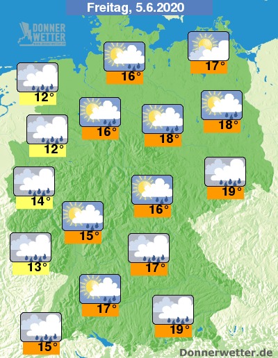Abgesehen von kurzen Zwischenauflockerungen- oder zum Teil auch Aufheiterungen ziehem immer wieder kompakte Wolken mit Regen und Schauern übers Land, örtlich kann es bei kräftigeren Regengüssen auch mal blitzen und donnern. Längere trockene Pausen gibt es in Teilen Nordostdeutschlands.
