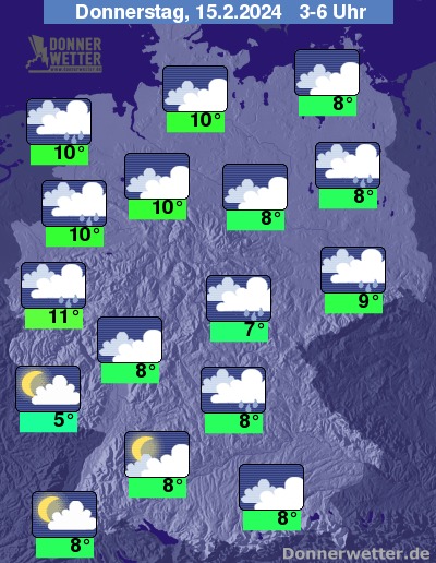 In der Nacht zum Donnerstag bleibt der Himmel weitgehend dicht bewölkt, lediglich im Süden und Südwesten lockert es gebietsweise auf, hier bleibt es weitgehend trocken. Im übrigen Land fällt weiterhin zeitweise Regen. Die Temperatur sinkt auf 11 Grad im Rheinland und bis 5 Grad im Saargau.