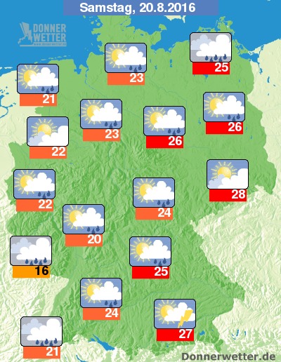 Heute zeigen sich hier und da heitere und dazu trockene Abschnitte, häufig ziehen aber auch viele und vielerorts dichte Wolken durch, die für zeitweiligen Regen oder Schauer sorgen. Lokal sind Gewitter zu erwarten. Gegen Abend heitert es im Nordwesten und im Westen verbreitet auf und es bleibt meist trocken. Die Temperatur steigt auf teils nur 16 Grad am Pfälzer Wald und bis 28 Grad in der Lausitz.