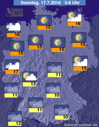 In der Nacht zum Sonntag ist es mit Ausnahme des Nordseeumfelds zunächst verbreitet sternenklar oder nur locker bewölkt und trocken. Jedoch ziehen zunächst an der Nordsee und später auch im übrigen Norddeutschland oft dichte Wolken mit möglichem Regen auf. Von der breiten Mitte bis nach Süddeutschland bleibt es trocken. Die Temperatur sinkt auf 17 Grad in Aachen und 10 Grad in Rosenheim.