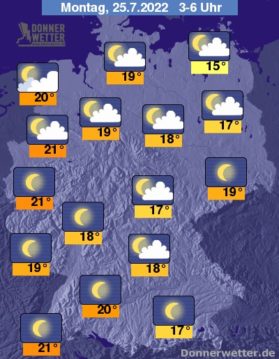 In der Nacht zum Montag ist es zunächst überwiegend sternenklar, im Norden und Nordwesten schon oft gering bis locker bewölkt. Im Nachtverlauf ziehen im Norden und vor allem im Nordwesten auch gebietsweise einige Wolken auf. Es bleibt landesweit trocken bei Tiefstwerten von 21 Grad in Meppen und 15 Grad in Stralsund.