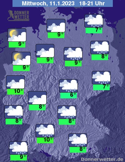 Am Donnerstag zeigt sich das Wetter stark bewölkt oder bedeckt, im Osten ist es zum Teil auch locker bewölkt. Es fällt zunächst nur selten Regen, ab den Mittagsstunden zieht allerdings von Westen her neuer Regen auf. Die Temperatur steigt auf 6 Grad in Mittelfranken und bis zu 11 Grad in der Kölner Bucht. An den Küsten ist es teilweise stürmisch.