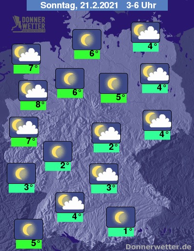 In der Nacht zum Sonntag ist es locker bewölkt, oft ist es auch sternenklar, dazu bleibt es trocken. Die Temperatur sinkt auf 8 Grad am Niederrhein und bis 1 Grad in Berchtesgaden.