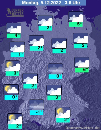 In der Nacht zum Montag bleibt der Himmel überwiegend bedeckt oder es ist trüb, lediglich im Süden und entlang von Ober- und Mittelrhein können sich einige Wolkenlücken zeigen. Stellenweise bildet sich Nebel, jedoch bleibt es weitgehend trocken. Die Temperatur sinkt auf 6 Grad in Dresden und -1 Grad im Raum Stuttgart.