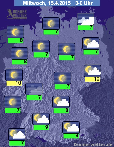 In der kommenden Nacht ziehen im Nordosten des Landes teils dichte Wolken durch, dabei bleibt es aber zumeist trocken. Im Süden und Osten ist es meist locker oder aufgelockert bewölkt, sonst wird es in Deutschland verbreitet sogar sternenklar. Dazu bleibt es trocken. Die Temperatur sinkt auf 10 Grad in Aachen und 7 Grad in Neubrandenburg.