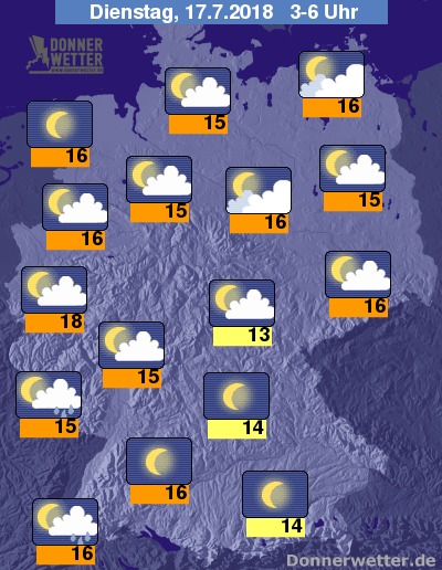 In der Nacht zum Dienstag können sich im Süden noch vereinzelt Schauer oder Gewitter bilden, sonst zeigt sich der Nachthimmel jedoch locker bewölkt oder sternenklar und nur selten sind mehr Wolken möglich, dazu bleibt es trocken. Die Temperatur sinkt bis Sonnenaufgang auf 18 Grad in Köln und bis 13 Grad im Thüringer Becken.