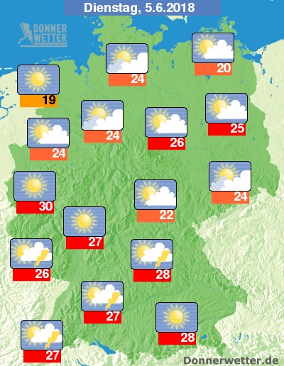 Am Dienstag bleibt es etwa nördlich des Mains verbreitet heiter bis sonnig und dabei trocken. Im Süden scheint zwar auch häufig die Sonne, jedoch können sich hier im Tagesverlauf örtliche Schauer und Gewitter entwickeln. Die Temperatur steigt auf 19 Grad an der Nordsee und bis 30 Grad im Rheinland.