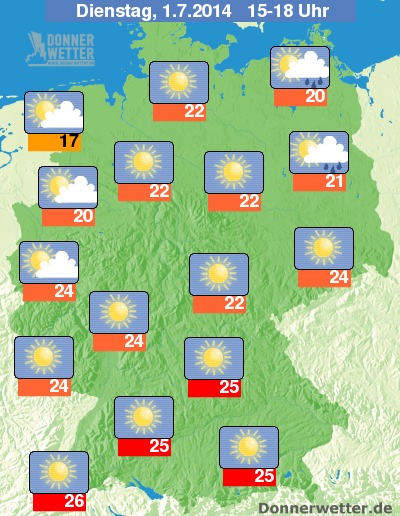 Am Abend ist es weiterhin vielfach klar oder nur locker bewölkt, ganz im Süden können die Wolken auch dichter sein, dabei bleibt es aber auch hier weitgehend trocken. Die Temperatur liegt bei teils noch 22 Grad in Freiburg und etwa 16 Grad im Norddeutschen Tiefland.