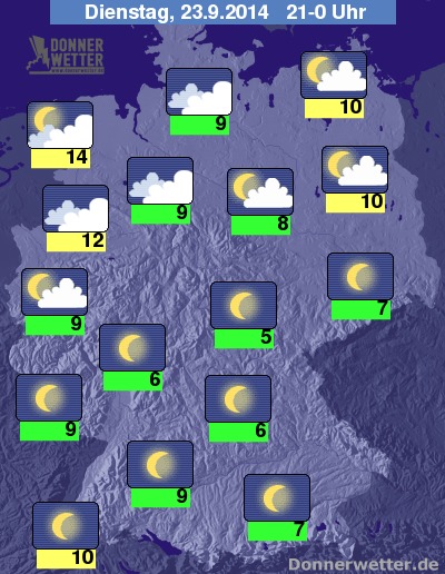 Heute Abend nimmt die Bewölkung im Nordwesten und Norden etwas zu, sonst bleibt es dagegen vielfach sternenklar. Es bleibt überall trocken. Die Abendtemperatur liegt bei 14 Grad auf den ostfriesischen Inseln und kühlen 5 Grad im Vogtland.