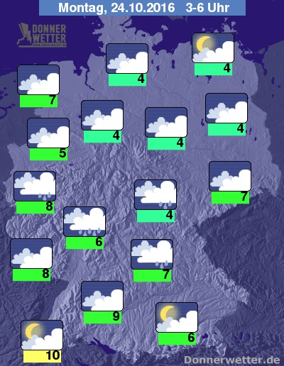In der Nacht zum Montag ist es im Norden anfangs noch locker bis aufgelockert bewölkt und dazu trocken. Sonst ziehen aus Südwesten kommend jedoch verbreitet dichte Wolken durch und es regnet in einem breiten Streifen vom Saarland, Rheinland-Pfalz bis in die Nordhälfte Bayerns zum Teil langanhaltend. In den übrigen Landesteilen bleibt es weitgehend trocken. Die Temperatur sinkt auf 10 bis 4 Grad.