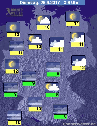 In der Nacht zum Dienstag halten sich vom Bayerischen Wald bis zum Erzgebirge noch häufig dichtere Wolken, die hier anfangs noch einzelne Schauer bringen können. Stark bewölkt bleibt es auch im übrigen Osten des Landes, sonst ist der Himmel aber verbreitet nur locker bewölkt oder sternenklar, dazu bleibt es trocken. Die Temperatur sinkt auf 12 Grad in Dresden und bis 8 Grad in München.