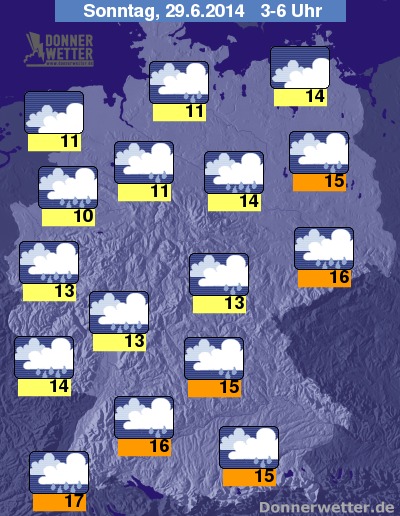 In der Nacht zum Sonntag fällt aus vielen dichten Wolken, teils ergiebiger Regen, im Norden bleibt es überwiegend trocken. Gebietsweise muss mit Regenmengen von über 15 Litern innerhalb von 3 Stunden gerechnet werden. Die tiefsten Temperaturen liegen bei 17 Grad im Breisgau und 10 Grad am Niederrhein.