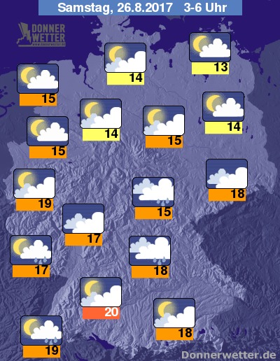 In der Nacht zum Samstag zeigt sich der Himmel über der Nordhälfte des Landes meist leicht bis aufgelockert bewölkt, hier bleibt es trocken. Im übrigen Bundesgebiet ziehen dagegen oft auch dichte Wolken auf und bis aufs südlichen Bayern und Baden-Württemberg bilden sich hier gebietsweise Schauer und auch mögliche Gewitter. Die Temperatur sinkt auf tropische 20 Grad in Stuttgart und bis auf 13 Grad an der Müritz.