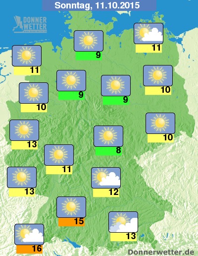 Heute scheint über dem Land verbreitet die Sonne von einem weitgehend wolkenlosen Himmel. Im Ostseeumfeld und zunächst auch im äußeren Süden Deutschlands zieht oft starke Bewölkung durch, es bleibt aber landesweit trocken. Die Temperatur steigt auf 8 Grad im Grabfeld und bis 16 Grad im Breisgau.