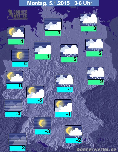 In der folgenden Nacht zieht sich der Himmel über der Osthälfte Deutschlands weitgehend zu und es fällt in den südlicheren Landesteilen dabei zeitweise Schnee, nach Norden hin fällt zeitweise Regen oder Schneeregen. Dabei kann es verbreitet glatt auf den Straßen werden. Weiter nach Westen hin bleibt es dagegen oft aufgelockert, zum Teil sogar sternenklar und trocken. Die Temperatur sinkt auf 4 Grad an der Nordseeküste und auf etwa -3 Grad am Bodensee.