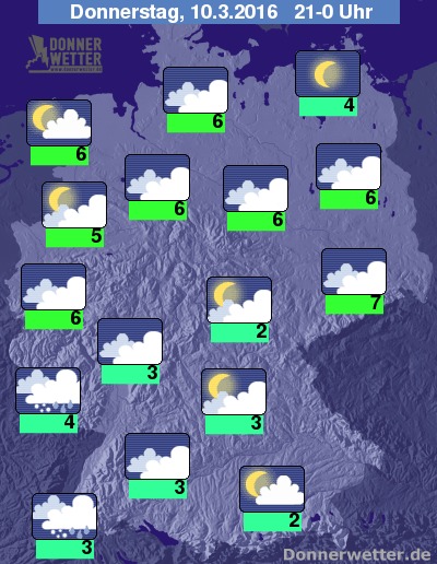 Heute Abend ziehen im Südwesten gebietsweise dichte Wolken mit etwas Regen oder Schneeregen auf. Auch in den anderen Landesteilen ist es häufig stark bewölkt, jedoch weitgehend trocken. Im Küstenumfeld und im Alpenvorland ist es meist nur locker bewölkt, teils auch sternenklar und dazu trocken. Die Abendtemperatur liegt bei 7 Grad in Dresden und etwa 2 Grad im Grabfeld.